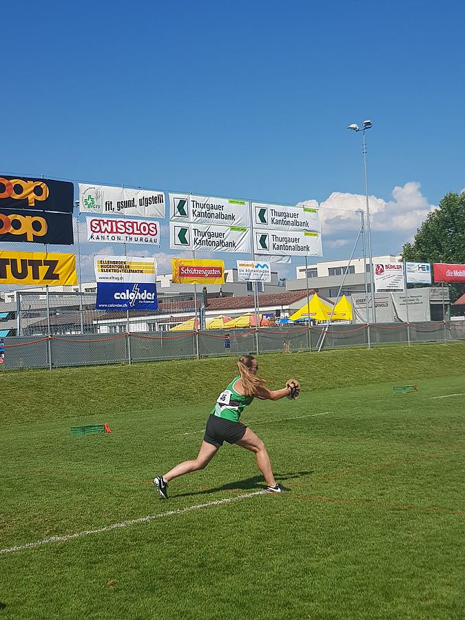 Währenddessen wärmte sich bereits die Fit & Fun Gruppe für ihren Wettkampf auf. Als erstes mussten sie Kraft und Technik beim Kugelstossen unter Beweis stellen. Für viele Turnerinnen war es nach dem Vereinsturntag in Ilanz erst der zweite Wettkampf mit dem TnV Trimmis. Mehrere persönliche Bestleistungen und das super Resultat von der Note 7.06 machte die Leiterinnen mehr als stolz.